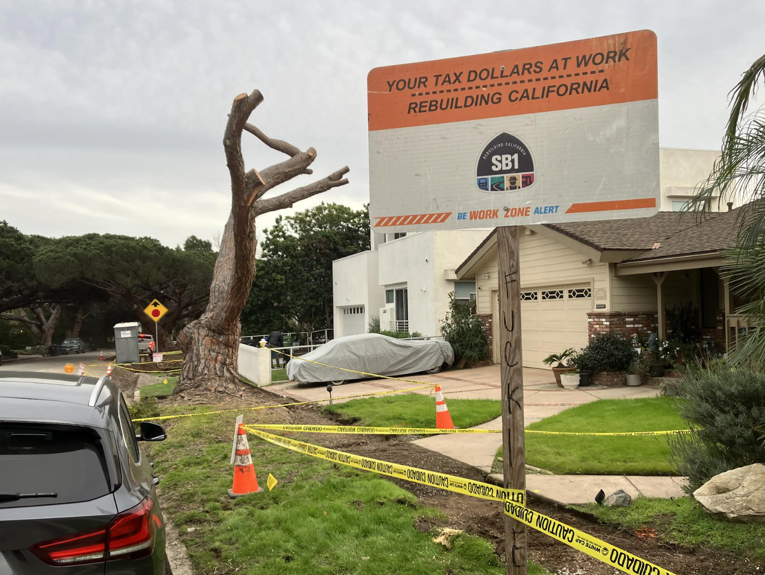 Photos from the site show trenches dug along the parkway, exposed roots, and newly poured sidewalks that curve and narrow to work around the trunks of mature trees. In several locations, concrete has been removed and replaced in ways that preserve existing canopy rather than remove it. A sign posted at the site indicates the work is funded through SB1, California’s transportation infrastructure program.